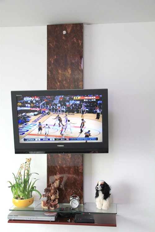 電動遙控電視機(jī)機(jī)架-導(dǎo)軌壁掛式從天花板到地面高度三分之二的墻面上安裝導(dǎo)軌,電視機(jī)架安裝在導(dǎo)軌上,電視機(jī)架在導(dǎo)軌上作垂直上下1100mm的自由升降,任意位置的停留;同時,電視機(jī)機(jī)架可作前后18度的傾斜動作以及左右36度側(cè)向角度調(diào)節(jié)。在導(dǎo)軌下端安裝有精致小巧的嵌入式懸空臺面,材質(zhì)可為玻璃或樹脂板材,可放置DVD,碟片盒,機(jī)頂盒或花瓶等裝飾性小擺件,其優(yōu)點為節(jié)省地面空間,易于打掃。