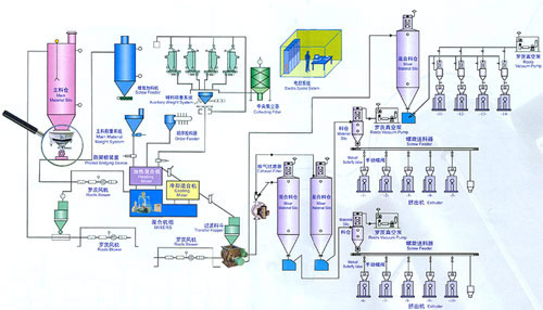 | 1、主料倉、輔料倉、開袋站:完成由散料(袋裝、槽車等)進(jìn)入料倉 |