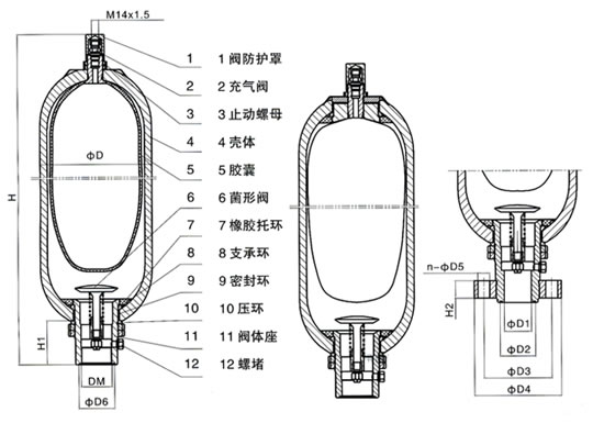 4.1 NXQA型蓄能螺紋連接結(jié)構(gòu)簡圖 4.2 NXQAB型蓄能器結(jié)構(gòu)簡圖 4.3 NXQ型蓄能器法蘭連接結(jié)構(gòu)簡圖