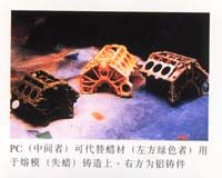 該材料只有75%密度,并不如注塑pc一般強(qiáng)硬。但由于這個(gè)特性,它能勝任制造熔模鑄造的模芯(當(dāng)遇熱時(shí),模芯 膨脹會(huì)被模體的疏孔抵消);它有著堅(jiān)固而耐溫的特性,比傳統(tǒng)蠟材模芯更方便打磨、存放及運(yùn)送(嚴(yán)寒時(shí)不會(huì)脆軟, 炎熱時(shí)不會(huì)軟化變形),且能做到極細(xì)微輪廓及薄壁(小于1mm)。
