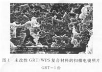 傳統(tǒng)的增韌理論認(rèn)為影響橡膠增韌塑料效果的主要因素為橡膠粒子的尺寸、橡腔粒子的間距、橡膠相和塑料相結(jié)構(gòu)及兩相的結(jié)合力。要起到明顯增韌作用.共混體系必須是微相分離的,且橡膠粒子的尺寸必須是微米級(jí)的,本實(shí)驗(yàn)所用膠粉是一種宏觀橡膠粒子粒徑(GRT80≈177um)遠(yuǎn)遠(yuǎn)大于增韌的最佳尺寸(1~3um):而且膠粉顆粒為交聯(lián)結(jié)構(gòu).妨礙了分子鏈的運(yùn)動(dòng)纏結(jié),與塑料基體界面結(jié)合非常薄弱,應(yīng)力集中很容易引起膠粉粒子宏觀剝離,在較低的外力作用下即發(fā)生界面破壞,因此(GRT/WPS復(fù)合材料的力學(xué)性能很差。在其掃描電鏡照片(圖1所示)中,斷面呈現(xiàn)明顯的脆性斷裂形貌,膠粉粒子宏觀剝離所留下的孔洞清晰可見(jiàn)。而復(fù)合材料的沖擊強(qiáng)度隨膠粉用量增加呈現(xiàn)先升后降的趨勢(shì),這可能是由于在膠粉用量較少時(shí),隨著橡膠粒子數(shù)目增多,粒子間距小,易產(chǎn)生多而短的銀紋,銀紋與粒子,銀紋與銀紋間相遇幾率增多,易于終止.所以表現(xiàn)為韌性有所增加,但仍遠(yuǎn)遠(yuǎn)低于塑料基體的強(qiáng)度。而膠粉用量再增大,在塑料基體中分散程度降低。粒子間距過(guò)小。將導(dǎo)致大量銀紋的產(chǎn)生,應(yīng)變迅速轉(zhuǎn)化為熱能,加速材料的破壞。 基于以上原因,要提高膠粉/塑料共混材料的力學(xué)性能?蓮膬煞矫婵紤]:一方面對(duì)膠粉進(jìn)行改性處理,如使膠粉部分脫硫來(lái)改善膠粉粒子的尺寸和結(jié)構(gòu);另一方面努力提高膠粉與塑料基體界面相容性,強(qiáng)化兩相界面結(jié)合。使之能有效地傳遞應(yīng)力。 2.2改性GRT用量對(duì)GRT/WPS共混物力學(xué)性能的影響 為了提高GRT/WPS共混材料的力學(xué)性能。采用不同改性劑對(duì)膠粉進(jìn)行改性。研究了改性膠粉的用量對(duì)于復(fù)合材料體系拉伸強(qiáng)度、沖擊強(qiáng)度等力學(xué)性能的影響。 2.2.1第一種改性GRT用量對(duì)GRT/WPS共混物力學(xué)性能的影響第一種改性膠粉的制備方法:以De-Link橡膠再生劑和SBR作為政性劑。將100份廢膠粉在開(kāi)煉機(jī)上翻煉5次混勻。然后按配方加入改性劑混煉均勻出片備用。溫度控制在70℃以下。 表2第一種改性膠粉用量對(duì)GRT/WPS共混物力學(xué)性能的影響