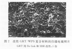 對(duì)比表1和表2可看出,采用De-link橡膠再生劑使膠粉交聯(lián)度降低和引入新的SBR膠料均可有效提高GRT/WPS復(fù)合材料的力學(xué)性能,且以兩者并用效果為好。對(duì)于不同方法制備的改性膠粉,均為用量5份時(shí)復(fù)合材料的綜合力學(xué)性能較好。如De-Link和SBR并用改性膠粉用量為5份時(shí),所得GRT/WPS復(fù)合材料沖擊強(qiáng)度較廢塑料基體提高了23.7%,而拉伸強(qiáng)度為基體的88.2%;較之未改性GRT/WPS復(fù)合材料,沖擊強(qiáng)度提高了2倍,拉伸強(qiáng)度提高了51.5%。 De-link橡膠再生劑是利用機(jī)械-化學(xué)方法使得硫化膠粉在機(jī)械的剪切作用下,發(fā)生化學(xué)反應(yīng)。破壞s-s和s-0交聯(lián)鍵,切斷部分分子鏈,使其交聯(lián)度和分子量降低,膠粉粒子細(xì)化。膠粉用量較少時(shí),在塑料基體中能夠得到較好分散,所以復(fù)合材料表現(xiàn)出較高的拉伸強(qiáng)度。隨膠粉用量的增加,復(fù)合材料力學(xué)性能降低,可能是由于膠粉在塑料基體中分散不夠好的緣故。 采用SBR對(duì)膠 粉進(jìn)行處理,一方面靠機(jī)械剪切作用使膠粉部分分子鏈斷裂,膠粉粒子變小,同時(shí)在破碎的膠粉粒子表面包覆一層丁苯橡膠層,利用SBR與聚苯乙烯類塑料具有良好的相容性。促進(jìn)膠粉在塑料基體中的分散和形成良好的界面粘結(jié)。從而賦予復(fù)合材料較高的沖擊強(qiáng)度。但由于膠粉粒徑較大。復(fù)合材料拉伸強(qiáng)度偏低。采用De-Link再生劑和SBR兩者并用來(lái)改性膠粉效果更好。其掃描電鏡照片如圖2所小。在其放大6000倍的掃描電鏡照片中可看到包覆了丁苯橡膠層的膠粉粒子粒徑較大,鑲嵌在塑料基體當(dāng)中,與基體界面粘結(jié)良好;塑料基體斷面裂紋互相交錯(cuò),表明試樣斷裂時(shí)需要較高的能量。2.2.2第二種改性GRT用量對(duì)GRT/WP5共混物力學(xué)性能的影響 第二種改性膠粉的制備方法:以特軟羧基丁苯膠乳(苯乙烯含量為40%)、BPO(甲苯溶液)和偶聯(lián)劑A-174(濃度為2%)作為改性劑,將100份廢膠粉按配方用改性劑溶液浸潤(rùn)、無(wú)殘余液體產(chǎn)生、先在鼓風(fēng)干燥箱中80[左右烘去大部分水,再在110℃下烘1H。將干燥后產(chǎn)物在開(kāi)煉機(jī)上混煉均勻出片備用。 由表3可以看出,以特軟羧基丁苯膠乳(苯乙烯含量為40%)、BPO(甲苯溶液)和偶聯(lián)劑A-174(濃度為2%)作為改性劑對(duì)膠粉進(jìn)行預(yù)處理后,其對(duì)于廢舊苯乙烯類混雜塑料基體的增韌效果最好。用量為5份時(shí)。沖擊強(qiáng)度較廢塑料基體提高了43.3%,而拉伸強(qiáng)度為基體的80.8%;較之未改性GRT/WPS復(fù)合材料,沖擊強(qiáng)度提高了2.5倍,拉伸強(qiáng)度提高了38.7%。 表3第二種改性膠粉用量對(duì)GRT/WPS共混物力學(xué)性能的影響