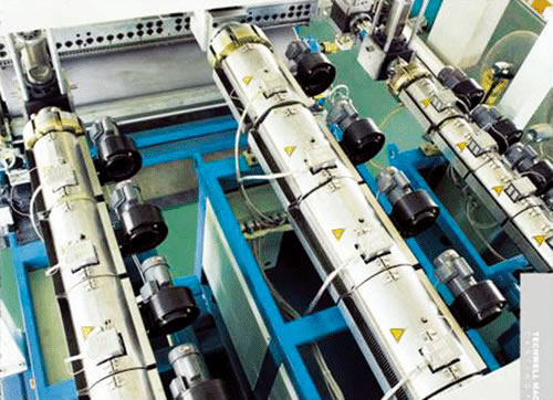 ● 共擠熔體經(jīng)T型平模頭擠出后在一個(gè)大直徑的急冷輥上驟冷和重新固化后成型;