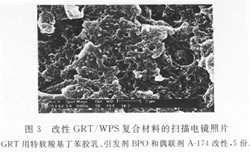 注:配方中WPS:100份;抗氧劑1010:0.1份;GRT為變量 復(fù)合材料在受到外加載荷作用時(shí),通常在界面造成應(yīng)力集中,應(yīng)力集中的部位將首先脫黏,進(jìn)而引發(fā)新的應(yīng)力集中,界面的逐步脫黏降低了界面的總承載能力。在材料的界面引人柔性層,可以松弛界面應(yīng)力,使應(yīng)力在界面均勻地傳遞,從而大幅度提高材料對(duì)沖擊能量的吸收和分散能力,提高材料的沖擊韌性。基于此,采用羧基丁苯膠乳,引發(fā)劑BPO和偶聯(lián)劑A-174處理膠粉,在膠粉的表面包覆一層橡膠層。以提高界面承載能力。 在預(yù)處理過(guò)程中。各組分之間可發(fā)生較為復(fù)雜的化學(xué)作用。首先,偶聯(lián)劑A-174可在膠粉中的炭黑表面形成化學(xué)鍵合。其次,在引發(fā)劑BPO作用下,丁苯膠乳、偶聯(lián)劑A-174以及膠粉中殘留雙鍵位置均可產(chǎn)生活性自由基,不同自由基之間發(fā)生碰撞偶合,則在膠粉與表面覆蓋的丁苯膠乳之間形成了牢固的化學(xué)鍵合。而丁苯橡膠層與聚苯乙烯混雜塑料基體間具有良好的相容性。因此,復(fù)合材料獲得較好的沖擊性能。從其SEM照片(如圖3所示)可看到,細(xì)小的膠粉粒子均勻牢固地鑲嵌在基體當(dāng)中,粒徑遠(yuǎn)小于SBR改性的膠粉粒徑;試樣斷面有絲狀撕裂和塊狀撕裂,表現(xiàn)出韌性斷裂的特征。 圖3 改性GRT/WPS復(fù)臺(tái)材料的掃描電鏡照片3 結(jié)論 1)加入未經(jīng)改性的膠粉引起廢舊聚苯乙烯類混雜塑料基體的力學(xué)性能大幅度降低。隨著膠粉用量的增加,沖擊強(qiáng)度呈現(xiàn)先升后降的趨勢(shì),拉伸強(qiáng)度逐漸下降。 2)對(duì)于不同方法制備的改性膠粉,均為用量5份時(shí)復(fù)合材料的綜合力學(xué)性能較好。其中,采用De-Link再生劑和SBR兩者并用來(lái)改性膠粉,所得GRT/WPS復(fù)合材料的拉伸強(qiáng)度最高,為基體WPS的88.2%,較之未改性GRT/WPS提高了51.5%;羧基丁苯膠乳、引發(fā)劑BPO和偶聯(lián)劑A-174并用來(lái)改性膠粉,所得GRT/WPS復(fù)合材料的沖擊強(qiáng)度最高,比WPS基體提高了43.3%,比未改性GRT/WPS復(fù)合材料提高了2.5倍。 作者:中國(guó)塑料機(jī)械網(wǎng) 來(lái)源:中國(guó)塑料機(jī)械網(wǎng)信息中心