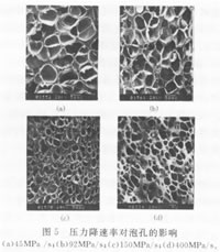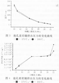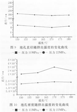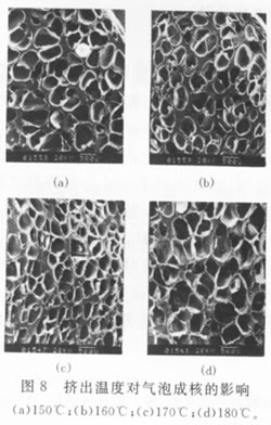 擠出口模溫度對(duì)微孔塑料成型的影響主要表現(xiàn)在以下幾個(gè)方面:1)溫度的升高可以降低界面張力,根據(jù)氣泡成核的聚合物刷子模型,能使所形成的氣泡核半徑減小。 2)氣體在聚合物熔體中的溶解度一般隨溫度的升高而降低,因此,當(dāng)溫度提高時(shí),氣體的溶解度會(huì)相應(yīng)降低,不利于微孔塑料的成核。 3)隨溫度的升高聚合物熔體的強(qiáng)度(根據(jù)定義,聚合物熔體強(qiáng)度可以認(rèn)為是當(dāng)氣泡發(fā)生膨脹時(shí),在氣泡壁周圍的流域中,氣泡壁對(duì)延伸流的阻礙程度)會(huì)降低.從而降低氣泡核的穩(wěn)定性,使氣泡容易發(fā)生合并、塌陷等現(xiàn)象, 不利于微孔塑料的加工。綜上所述,在微孔塑料的加工過程中,適當(dāng)提高溫度有利于微扎塑料的成型。 圖8是在機(jī)頭口模入口壓力均為11MPa的情況下,在不同溫度下所得的泡沫塑料SEM照片(所用口模為Ⅲ號(hào))。圈9是泡孔直徑隨溫度的變化曲線,圈10是泡孔密度隨溫度的變化曲線。在圖8中,還畫出了壓力為22MPa時(shí)臨界氣泡核半徑隨溫度的變化曲線。從圖9和圖10可以看出,當(dāng)溫度低于某一值時(shí),泡孔直徑隨溫度的升高而減小,泡孔密度隨溫度的提高而增大。但當(dāng)溫度超過一定值時(shí),泡孔直徑反而隨溫度的提高而增加,泡孔密度隨溫度的增加而減小。這是由于泡孔尺寸和密度是成核和長(zhǎng)大的綜合反映。在高溫時(shí),氣泡的長(zhǎng)大速度非?欤瑲馀莸暮喜F(xiàn)象占了主導(dǎo)地位,使得制品的平均尺寸遠(yuǎn)大于不發(fā)生氣泡合并與塌陷時(shí)的氣泡尺寸,泡孔的密度遠(yuǎn)低于成核密度(相對(duì)溫度輕低時(shí))。 3結(jié)束語(yǔ) 微孔塑料作為一種新型材料,具有非常優(yōu)異的性能和廣闊的應(yīng)用領(lǐng)域。已引起發(fā)達(dá)國(guó)家的高度重視,許多著名公司如美國(guó)Trexcl、Microcellular Plastics Techonology 、Axiomatics公司;日本的SeKISUI Plasticsof Tokyo公司;加拿大的Engel公司等都已致力于微孔發(fā)泡技術(shù)的實(shí)際應(yīng)用開發(fā)及商業(yè)化推廣。國(guó)內(nèi)從1995年開始研究微孔塑料,在理論上取礙了一定進(jìn)展,并已在實(shí)驗(yàn)室制備出多種型號(hào)的微孔塑料。隨后,一些高校也相繼進(jìn)行了微孔塑料的研究。但離微孔塑料的產(chǎn)業(yè)還有一段距離,還需要作大量基礎(chǔ)性的研究工作。 作者:中國(guó)塑料機(jī)械網(wǎng) 來(lái)源:中國(guó)塑料機(jī)械網(wǎng)信息中心